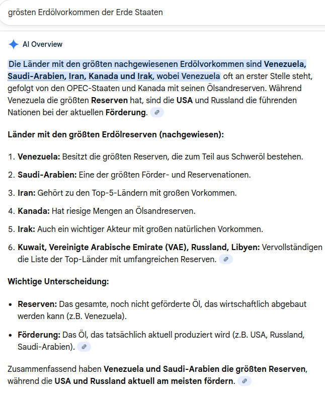 Wenn ihr euch Erinnert Trump wollte am Anfang seiner Amtszeit auch eine Union mit Kanada. Warum wohl – Kanada hat auch enorm viel Erdöl. Grönland das da auch dabei war dürfte eher mit dem Kampf um die Vormacht in der Arktis zu tun haben das ist ein anderes Thema aber die Wirtschaft von heute braucht Öl. Erst Recht wenn man vom Kllma Wandel nichts hält ( in dem Punkt muss ich Trump zustimmen von dem halte ich auch nichts). Aber die Kanadier wollen nicht und denen kann man nicht so leicht Drogenhandel nachsagen. Einen Krieg mit Saudi Arabien Riskieren? da hast du bald den dritten Weltkrieg zwischen Moslems und Christen. Die Saudis sind gute Vernetzt nicht so gut wie die Chinesen aber doch sehr gut Mit dem Iran versteht sich die USA traditionell nicht gut. Noch dazu war der Beitritt des Iran zu den Brics Staaten eine direkte Folge der Erfolge Russlands im Ukraine Kriegs Sorry der russischen MSO in der Ukraine. Aber Venezuela das ist nicht weit weg und liegt neben Kolumbien in Kolumbien gibst viele Drogenhändler da wohnen sicher ein paar in Venezuela vielleicht auch nicht aber wen interessiersts die haben Öl. Noch dazu das größte Nachgewiesene Vorkommen der Welt. Trump ist nicht schwer zu durchschauen er ist ein Ehrlicher Wirtschaftler und er will um jeden Preis Amerika Great again machen. allerdings werden seine Methoden in letzter Zeit immer Fragwürdiger. Und ich glaube er steht auf verlorenem Posten die Zeit für die USA läuft ab. Oder ist schon abgelaufen. Amerika wird nicht so schnell von der Bildfläche verschwinden das römische Reich hat auch 100 Jahre gebraucht um unter zu gehen. Aber die neuen Player sind die Brics Staaten und ihre Partner. und die werden buchstäblich jedes Jahr mehr. Das wiederum setzt Die USA und auch Europa unter Druck und Venezuela ist das Land das den Ärger abbekommt – weil sie Öl haben. und die Wirtschaft immer noch Öl braucht.
